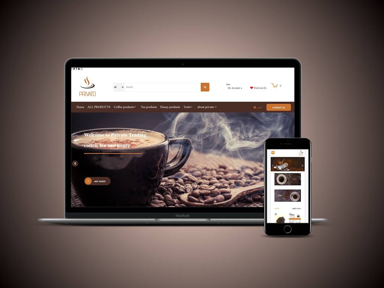 لقد تم الإنتهاء فى شركة الرياض من تصميم متجر بريفاتو المتخصص في تقديم منتجات القهوة والشاي والعسل وتموين
